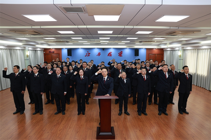 小丑撸 党组成员、副检察长熊良明领誓,小丑撸 副检察长杨峰、南昌铁路运输检察分院检察长张诗美等53名小丑撸 及派出院2024年度新任检察官、新任处级领导干部、新入职人员参加宣誓。