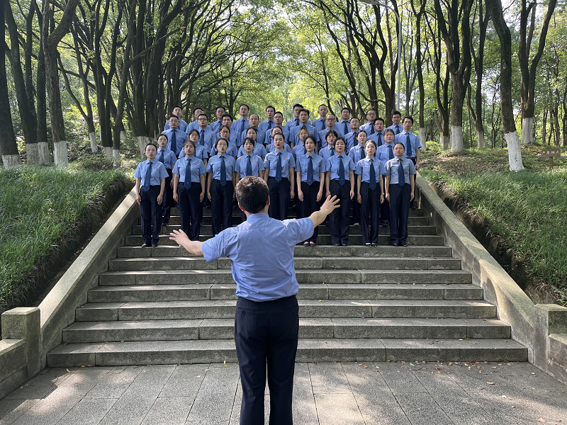随后,青年干部整齐列队,怀着对党的无比崇敬之情,齐声高唱《没有共产党就没有新中国》。高昂的歌声在梅岭山间回响,在青年干部心中荡漾。